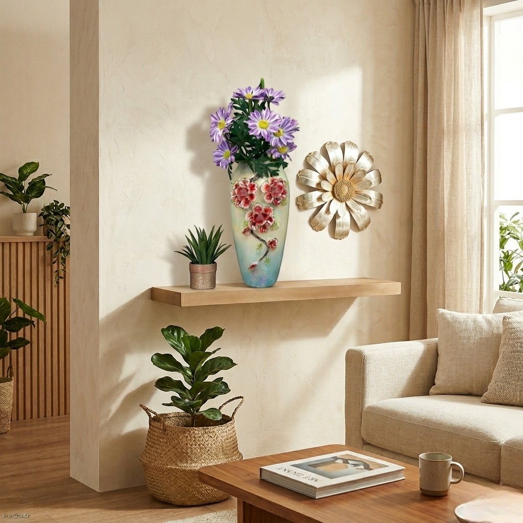 Detailing: 3D sculpted ceramic flowers with gold-colored accents