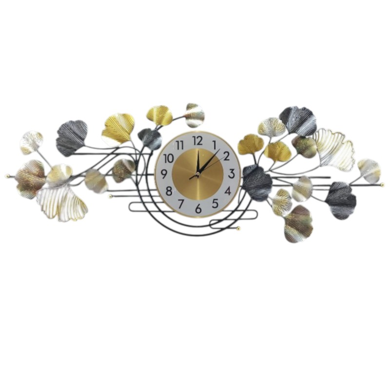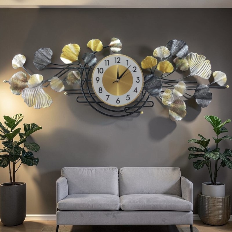 This striking timepiece features an artistic arrangement of beautifully crafted metallic ginkgo leaves in a luxurious gold and a contrasting charcoal grey, creating a rich and dynamic visual appeal. The leaves are gracefully positioned on sleek black metallic branches, which subtly intertwine around the central golden clock face. Clear black Arabic numerals from 1 to 12 ensure effortless readability. This horizontal design is an ideal focal point for a living room, dining area, hallway, or office, perfectly complementing modern, industrial, and chic transitional interior styles.