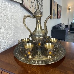 The set includes a tall, curved-spout serving pot, six matching cups with handles, and a large decorative tray. Each piece showcases a rich antique finish with gemstone-style accents, making it perfect for special occasions, festive hosting, or gifting.