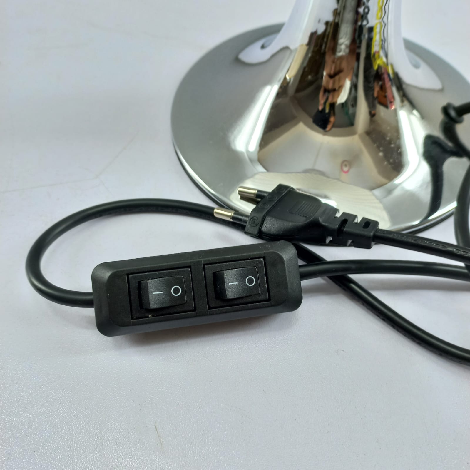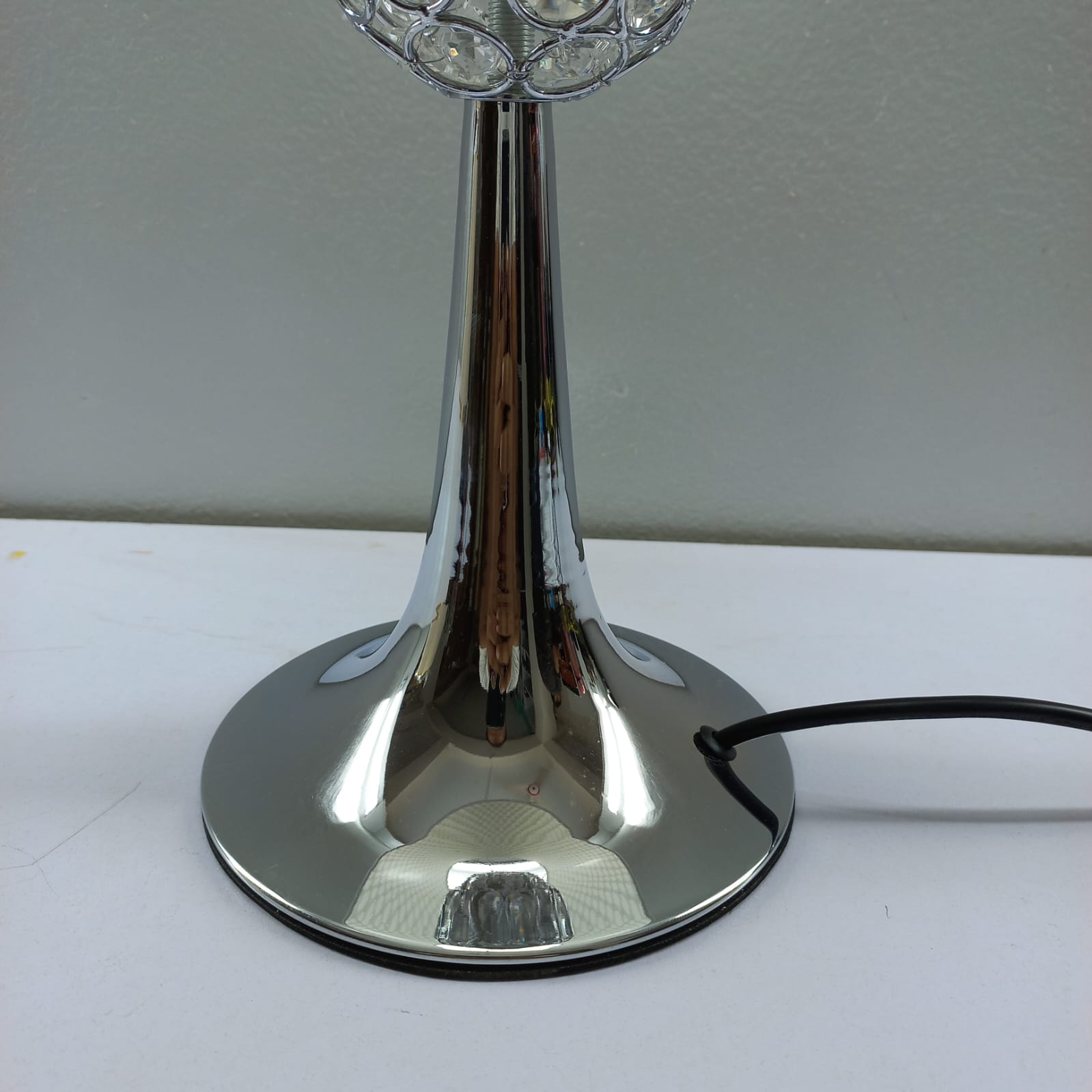 Modern Chrome Base: Durable metallic stand with a reflective finish for a contemporary look.