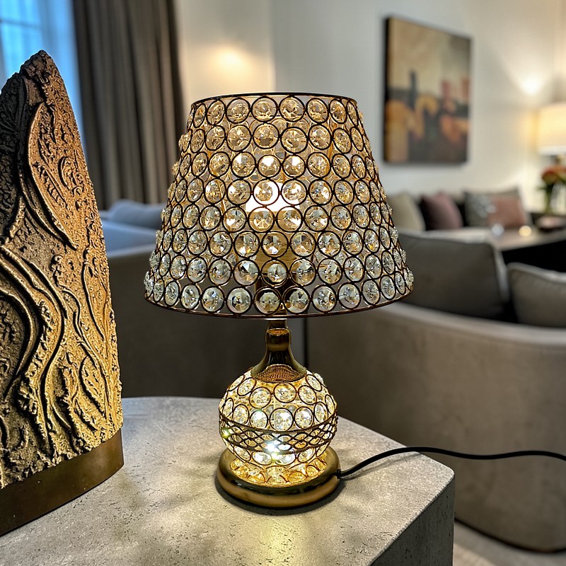 Brighten any room with this exquisite Crystal Brilliance Gold Table Lamp. A perfect blend of traditional luxury and contemporary craftsmanship, this lamp is designed to be a centerpiece that captures attention whether it’s turned on or off.