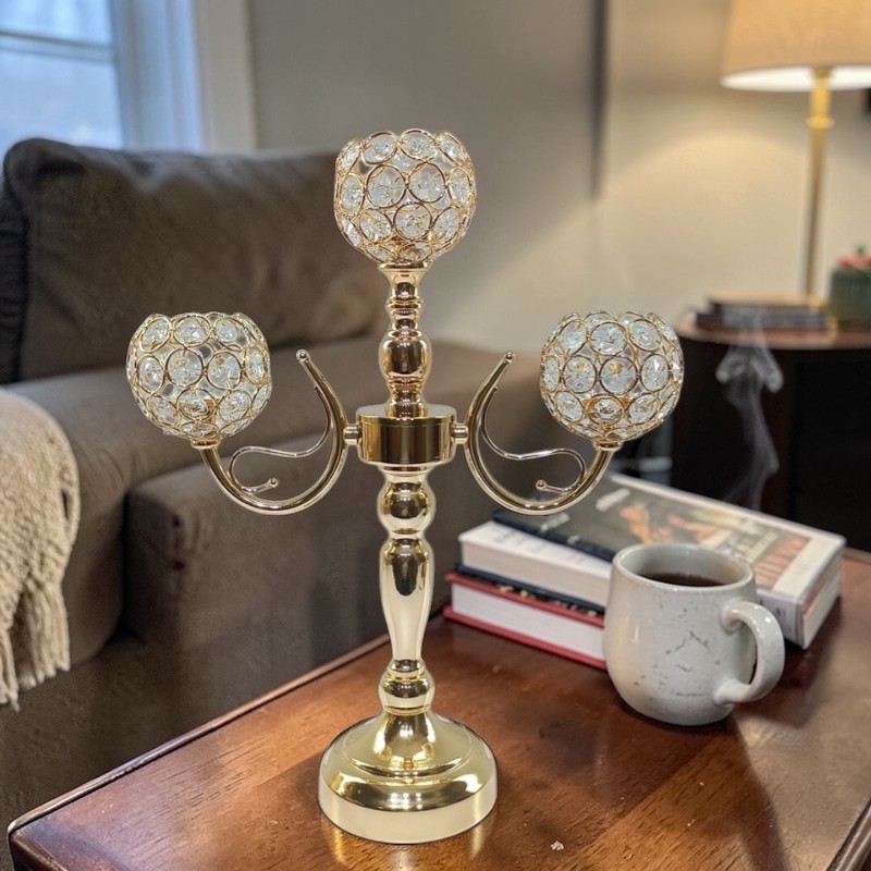 Elevate your home ambiance with this stunning 3-arm crystal candelabra. Crafted with a brilliant gold-finished metal frame, this piece features three exquisite globe-shaped candle holders. Each globe is intricately designed with interconnected faceted crystals that catch and reflect light, creating a shimmering, luxurious glow when paired with tea lights or small candles.