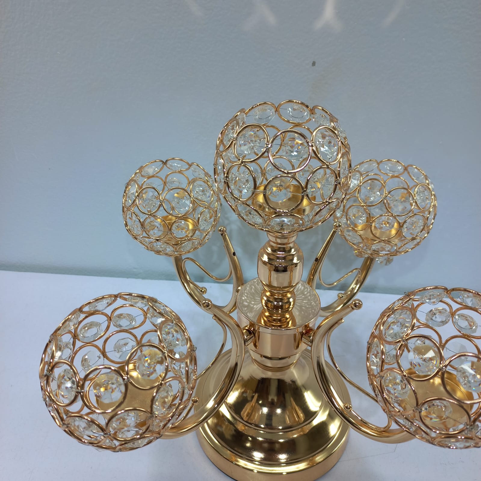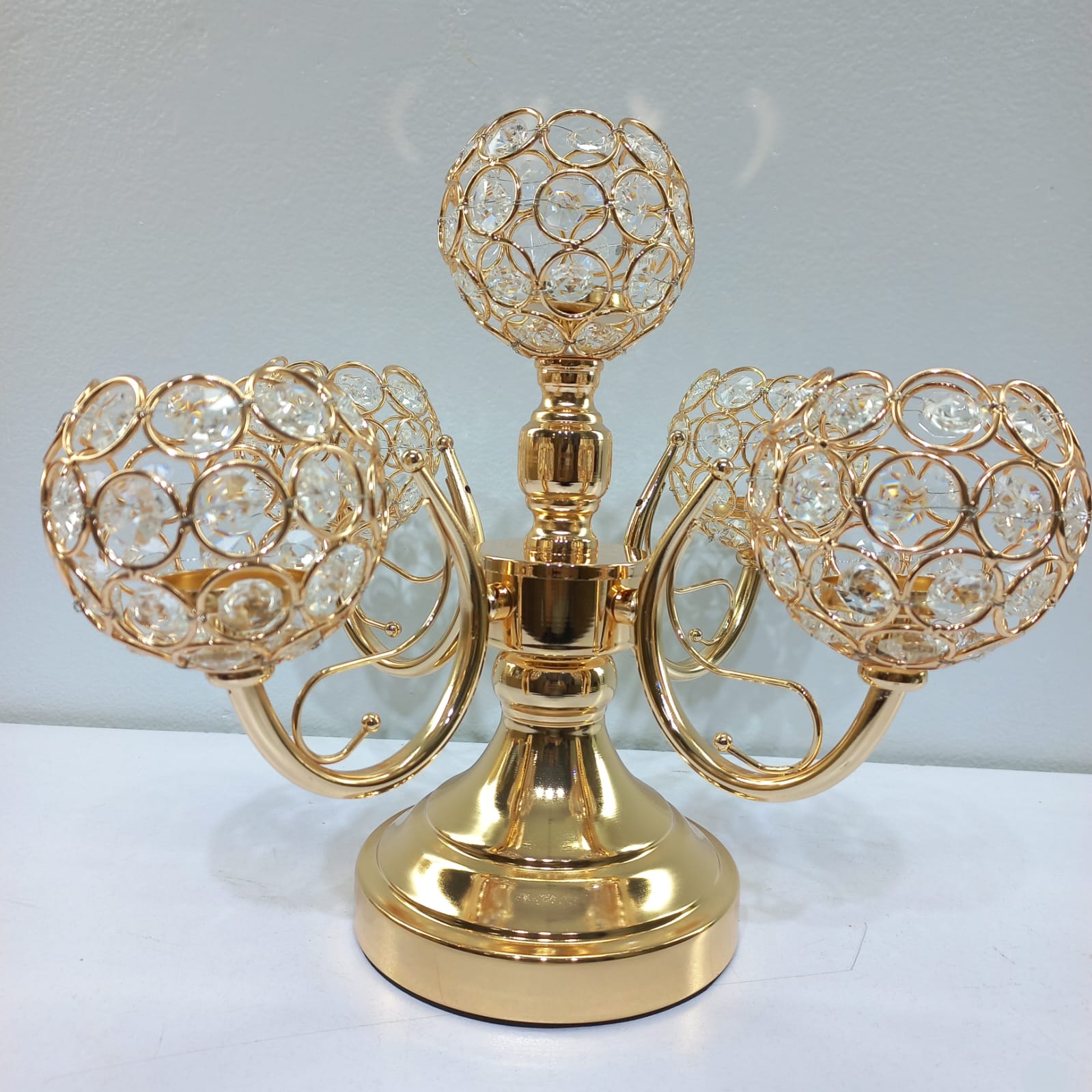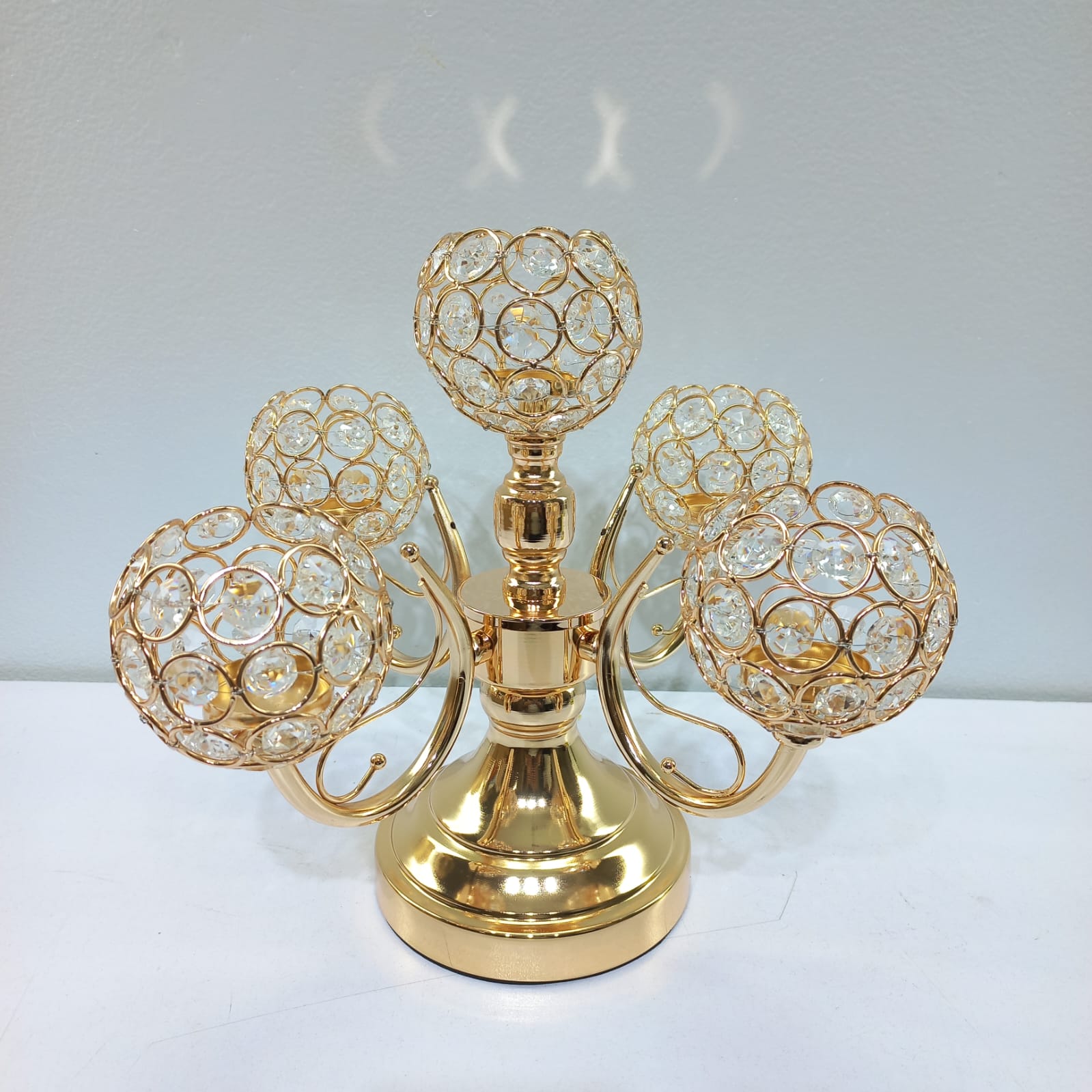 Add a touch of regal sophistication to your space with this stunning 5-arm crystal candelabra. Designed with a high-shine gold finish and intricate crystal detailing, this piece serves as a breathtaking centerpiece for dining tables, weddings, or luxury home decor.