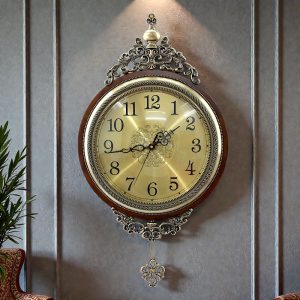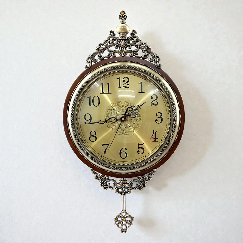 Evoke the grandeur of a classic era with this ornate pendulum wall clock. Designed with a rich wood-tone circular frame and intricate antique-gold filigree crown and base, this timepiece adds a regal touch to any traditional interior. The golden dial features a detailed sunburst center and bold Arabic numerals for easy reading. A delicate, swinging pendulum with matching filigree completes this vertical masterpiece, making it a timeless addition to your home.