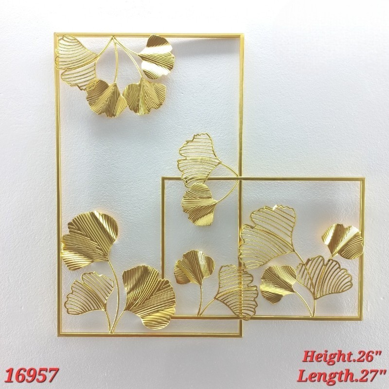 This artistic piece features a dynamic, multi-dimensional design that plays with geometry and nature. It showcases gold-finished ginkgo leaves gracefully layered within and across two overlapping rectangular frames.