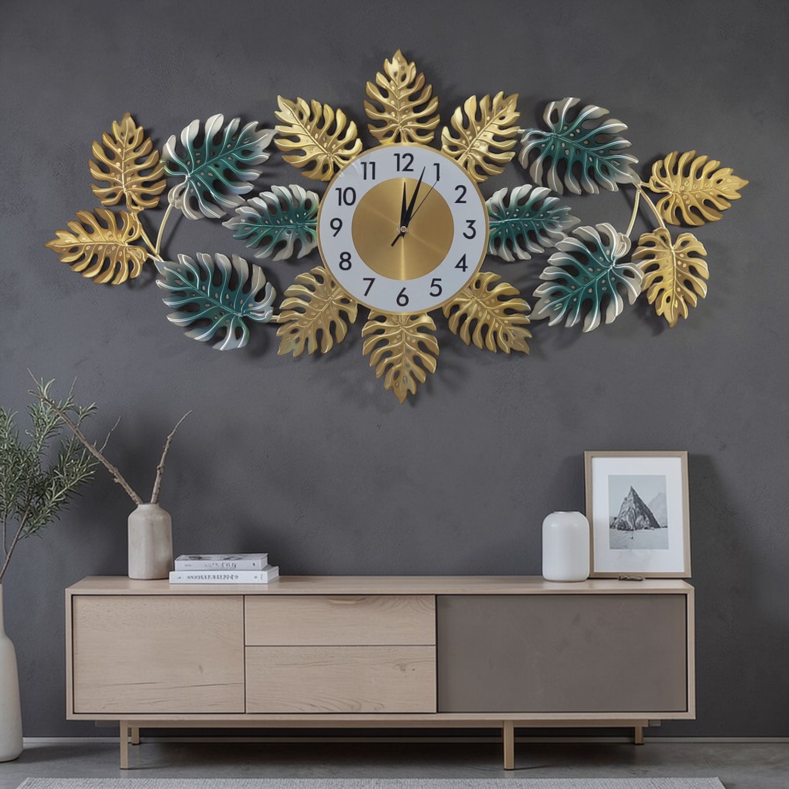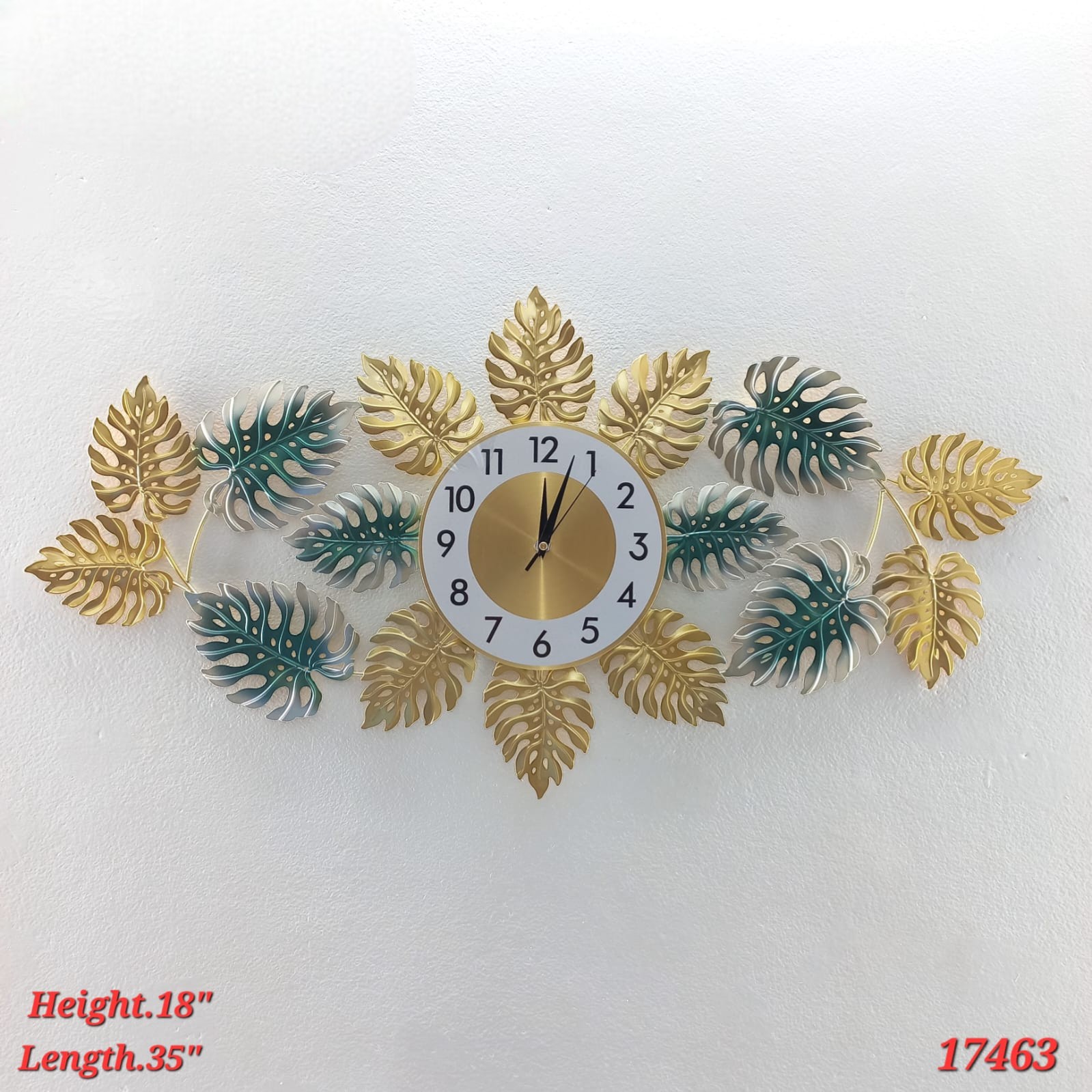 Bring nature-inspired elegance to your home with this stunning tropical leaf metal wall clock. Designed with a beautiful mix of gold and teal monstera-style leaves, this artistic timepiece adds a modern luxury touch to any wall. The sleek round dial with bold numbers ensures easy time reading while the decorative leaves create a statement décor piece.