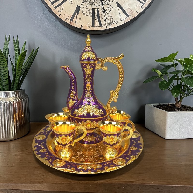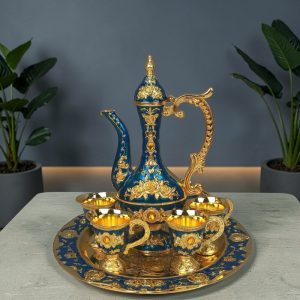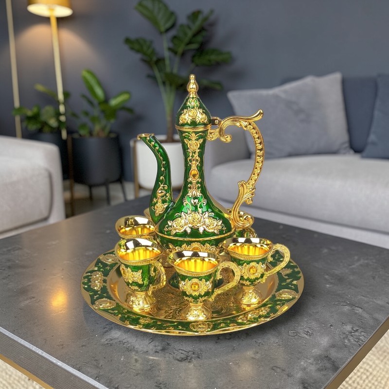 Elevate your hosting experience with this exquisite Turkish serving set. Each set is meticulously crafted with a high-quality metallic finish, featuring a tall, elegant dallah (pitcher), six matching handled cups, and a coordinating serving tray. The set is decorated with intricate 3D floral motifs and filigree patterns, offering a royal aesthetic that fits both traditional and modern luxury interiors.