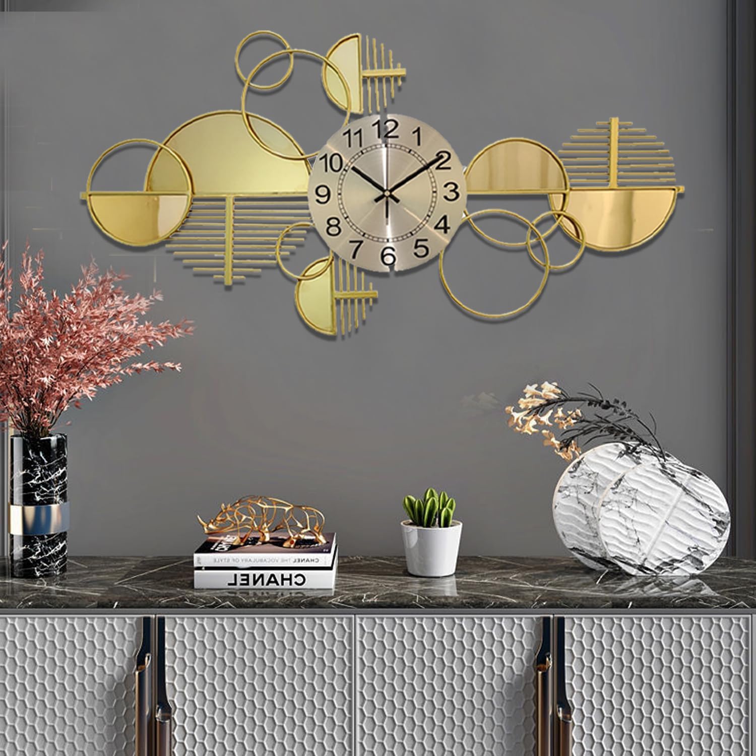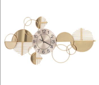 Enhance your living space with this modern geometric metal wall clock, designed to combine minimalism with luxury. Featuring a sleek round dial with bold, easy-to-read numbers, the clock is surrounded by artistic gold circles, semi-discs, and linear accents that create a stylish abstract composition. The polished gold finish adds a sophisticated shine, making it a perfect centerpiece for modern and contemporary interiors.