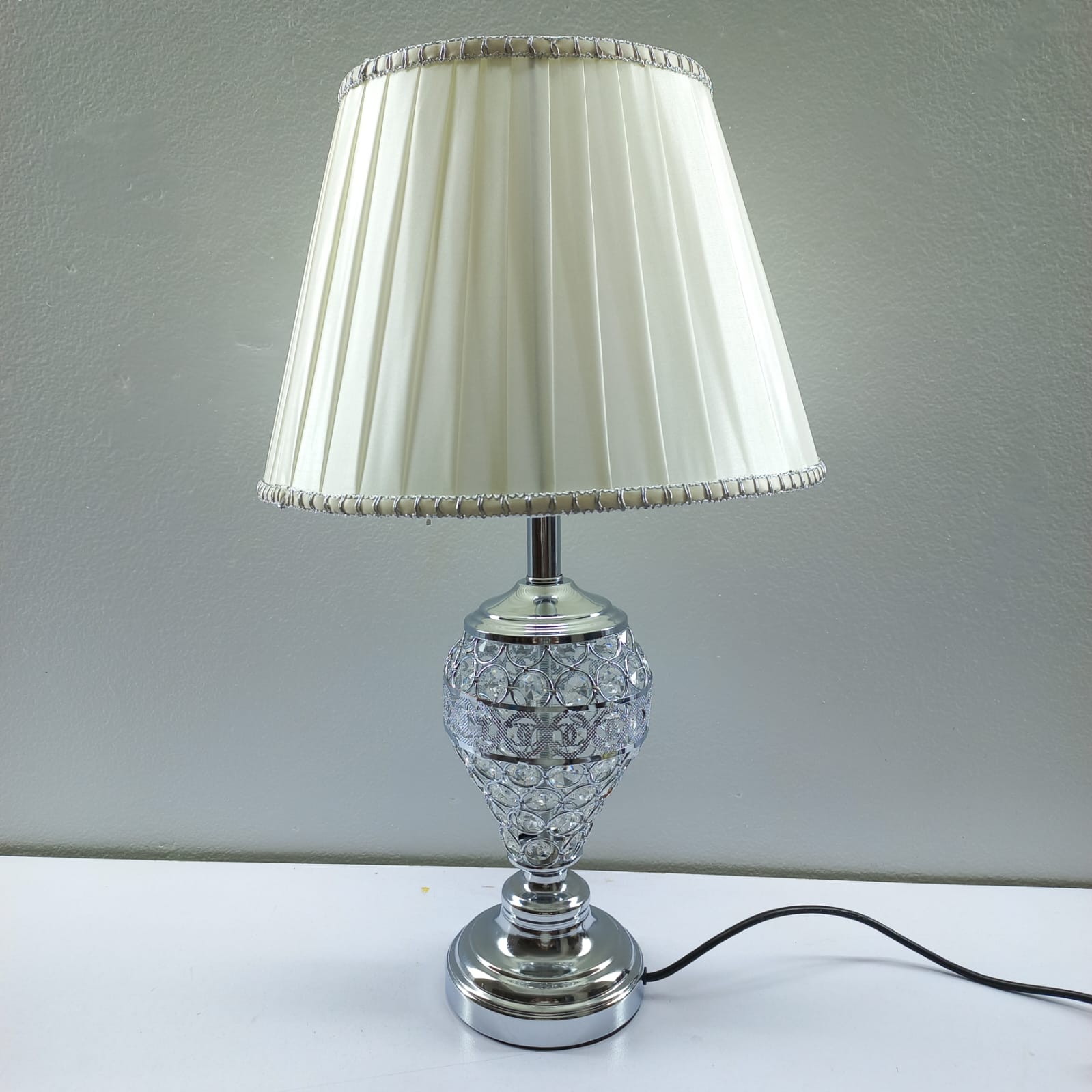 Enhance your interior with this exquisite table lamp, designed to bring a touch of timeless luxury to any room. Featuring a stunning crystal-encrusted base and a classic pleated fabric shade, this lamp creates a captivating interplay of light and shadow, making it a perfect statement piece for your bedside table, living room, or office.
