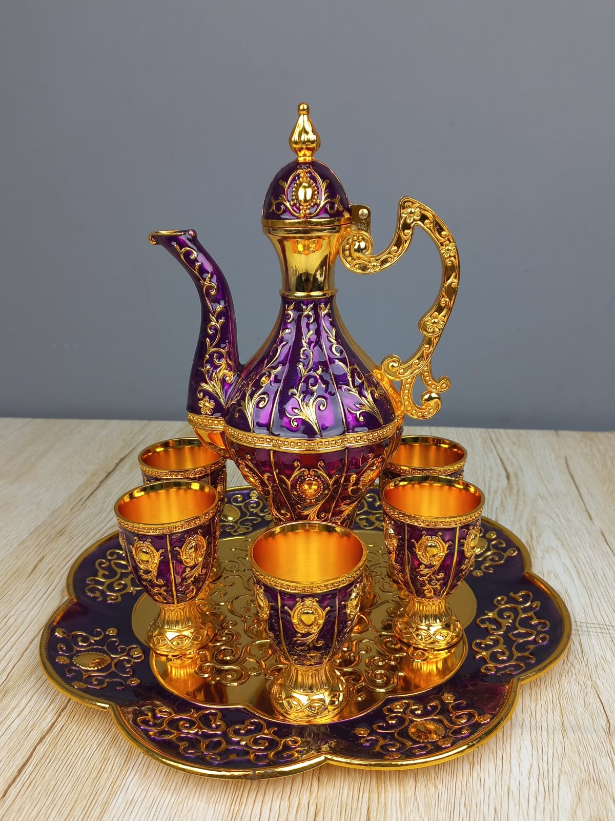 This exquisite collection features a traditional Turkish Arabian aesthetic, characterized by rich enamel work and elaborate gold-plated floral filigree. Each set includes a tall, decorative pitcher (dallah) with a hinged lid, six matching stemmed cups, and a scalloped serving tray with a mirrored golden center.